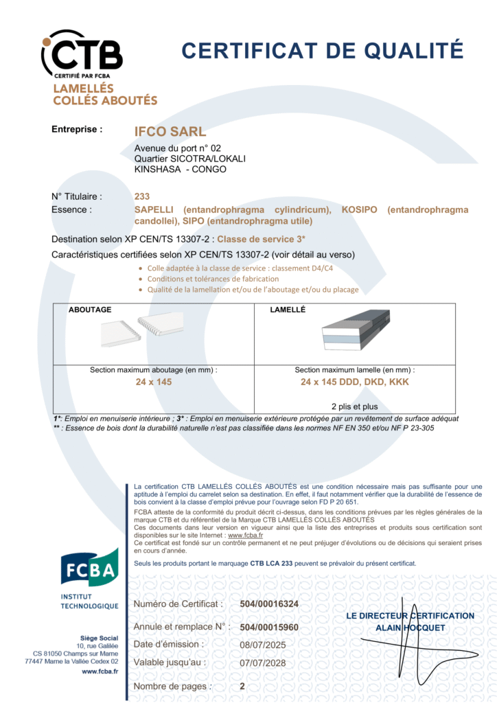 Nous sommes ravis d’annoncer que l’Institut Technologique FCBA a décerné à l’Industrie Forestière du Congo (IFCO), le prestigieux certificat CTB-LCA pour ses profilés Lamellés-Collés-Aboutés en Sapelli, Sipo et Kosipo.